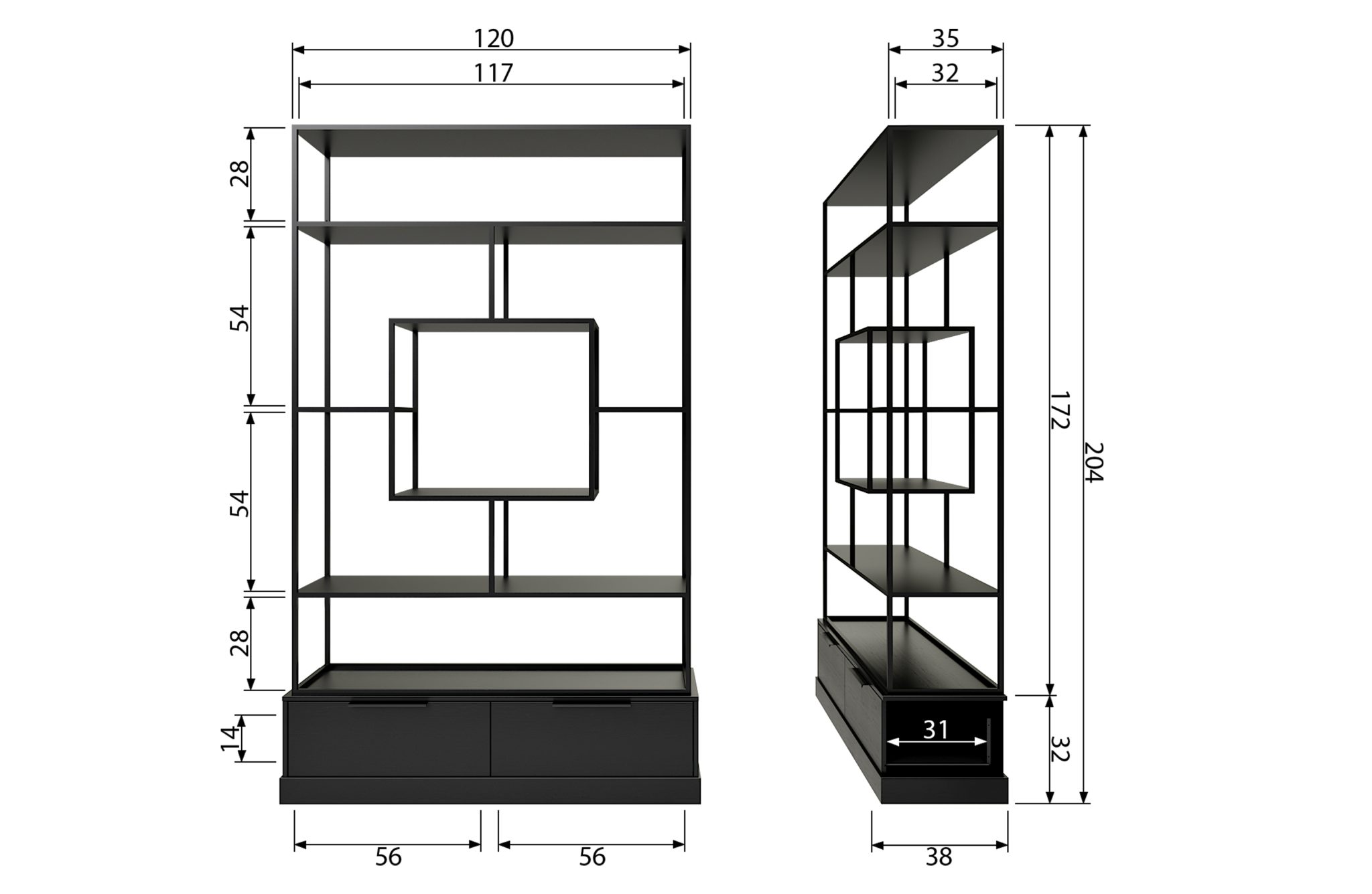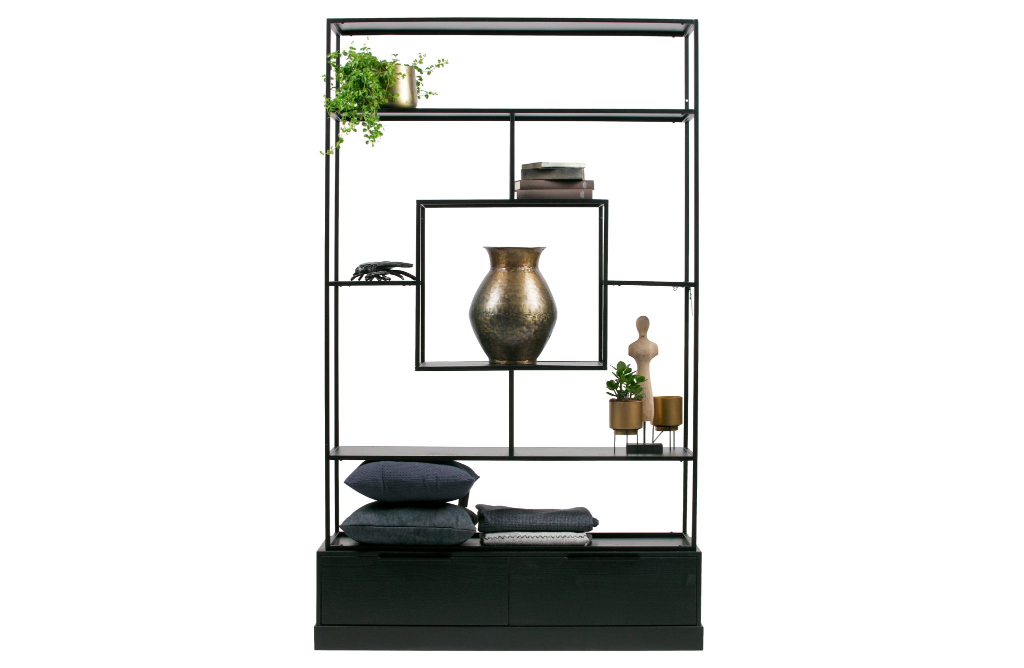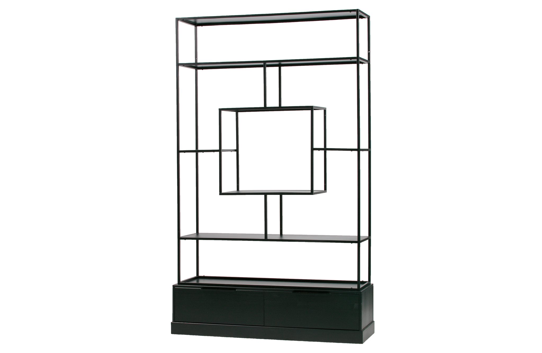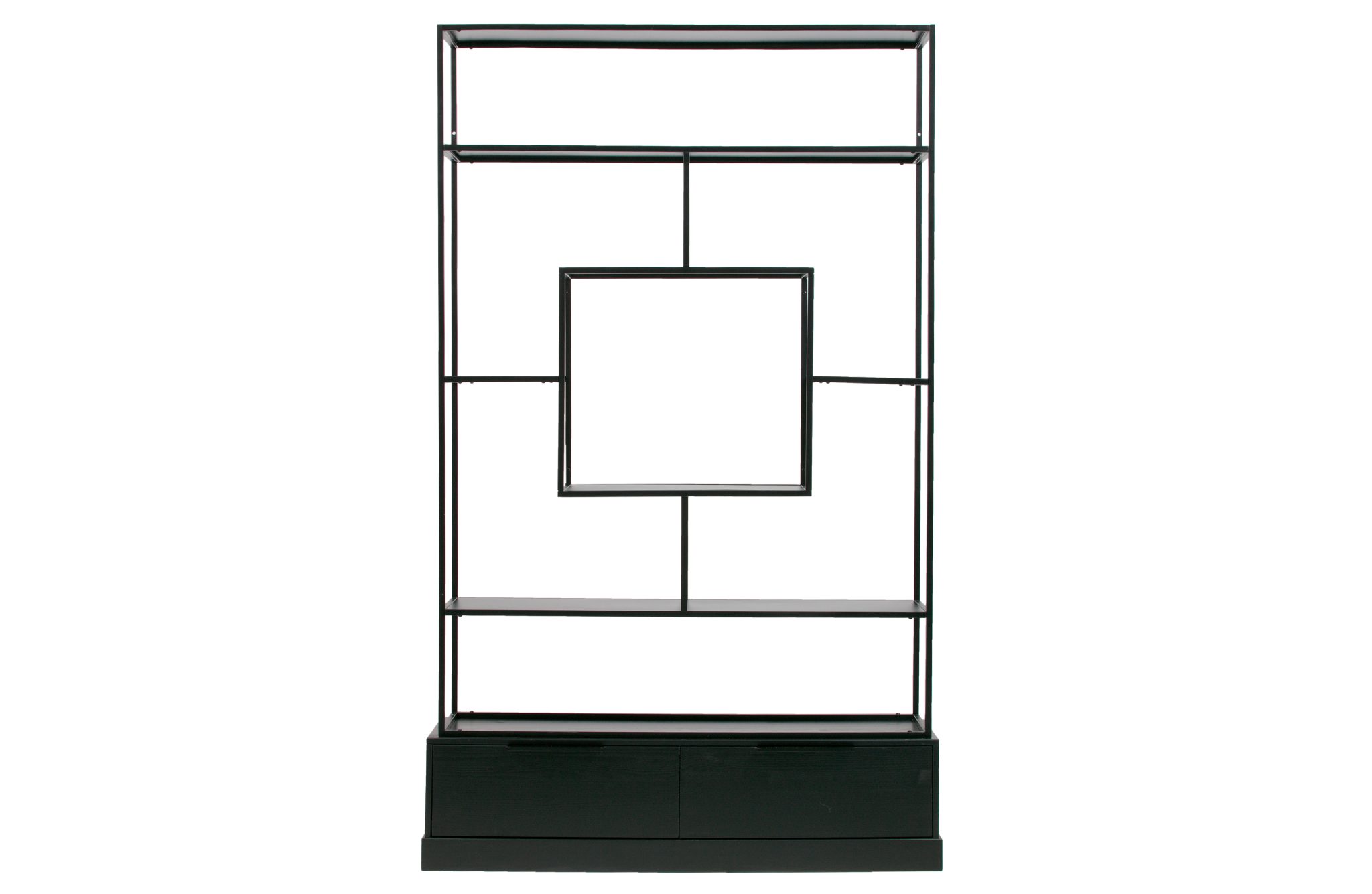 With the black lacquered metal cabinet Fons, dimensions (hxbxd): 204x126x38 cm, you have a trendy and contemporary cabinet for both in the living room and in a bedroom / work room. The Fons compartment, by the brand WOOOD Exclusive, is made of a metal tubular frame, black lacquered, combined with two black lacquered pine sanded drawers. In the middle there is a large square compartment where you can place a real eye-catcher! You can attach the Fons cabinet to the wall or place it as a room divider.