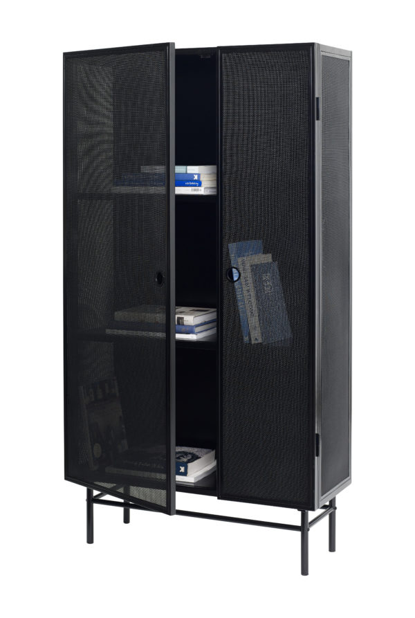 Tøft skap fra Hübsch i sort stål med mesh dører.