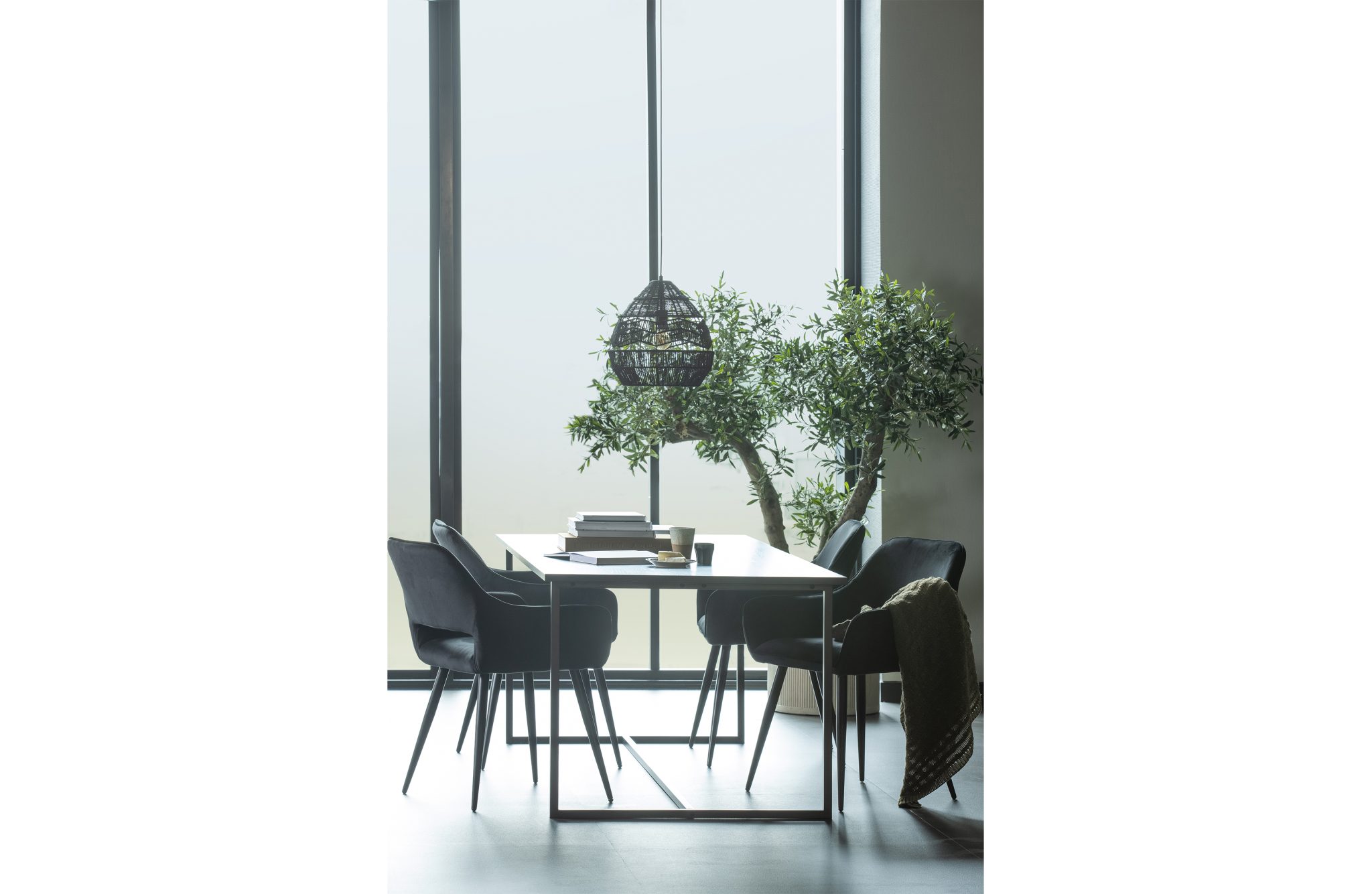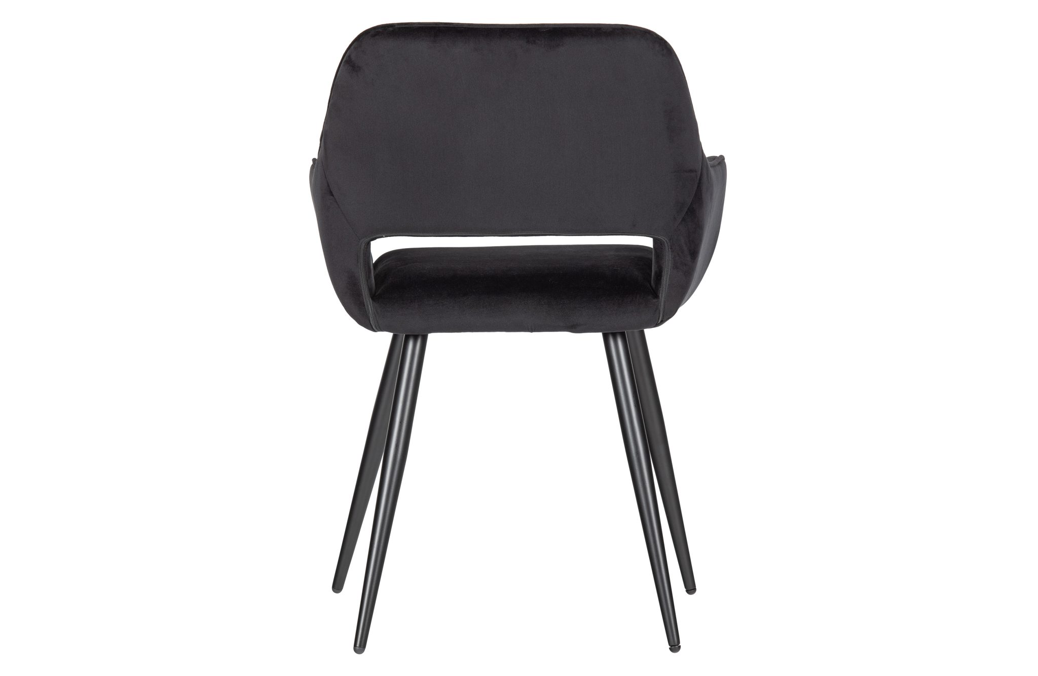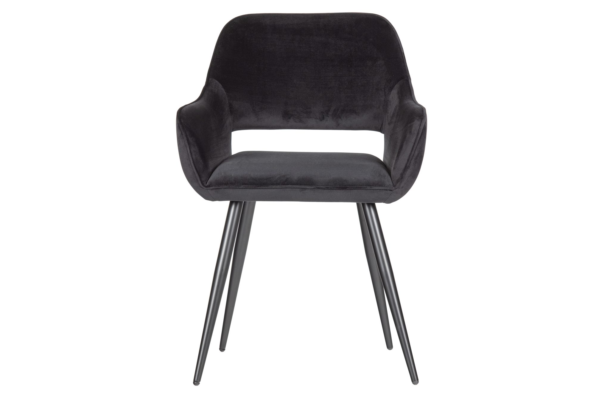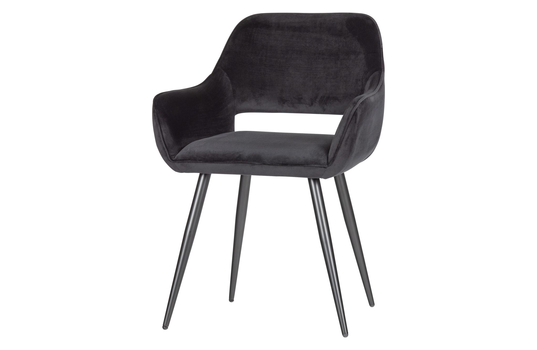 The contemporary WOOOD (set of 2) dining chair Jelle has a unique formed seat part! This chair is not only a beautiful item, but has a really good sit as well. The sizes are (hxwxd) 80x60x57 cm. The seat height is 49 cm, the seat depth is 45 cm and the seat width is 42 cm. The comfortable armrests are an extra plus for this dining chair. The Jelle dining chair is furnished with a velvet soft fabric in the color black. With its nice form and the black metal legs, this chair is an addition to your interior.