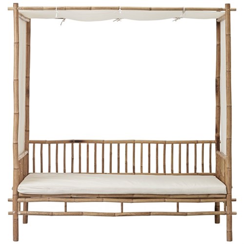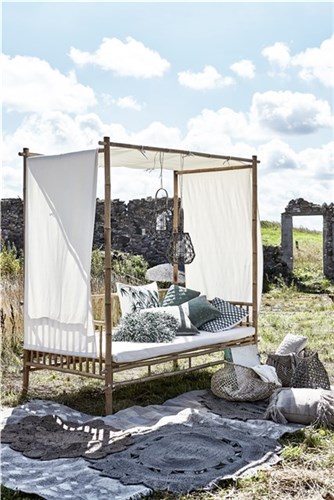 Håndlaget bambus daybed/sofa i fargen natur fra Lene Bjerre. Daybeden har hvit pute og er beregnet til både innendørs og utendørs bruk.
